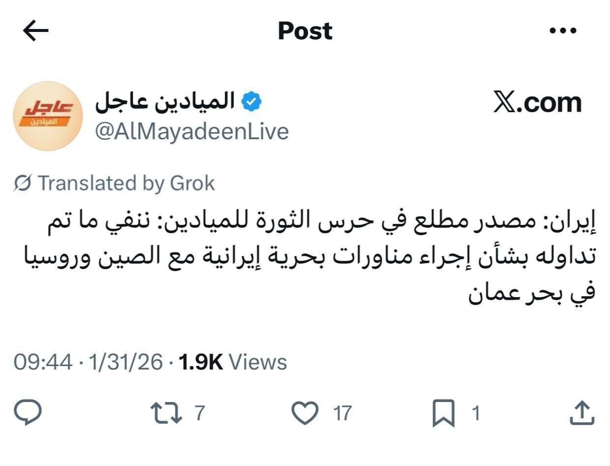 شبکه المیادین به نقل از یک منبع در سپاه پاسداران انقلاب اسلامی گزارش داد که تهران، گزارشها درباره برنامهریزی برای برگزاری رزمایش مشترک دریایی با روسیه و چین در خلیج عمان را رد کرده است.